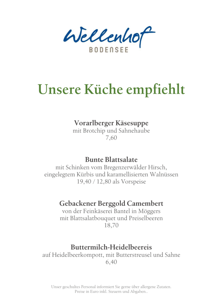 Wir bekochen und bewirten Sie ganzjährig in unserer renovierten Gaststube und in der warmen Jahreszeit auch auf der Terrasse mit einmaligen Blick auf den Bodensee. Unsere Speisekarte offeriert vorwiegend traditionelle österreichische Speisen mit Fokus auf qualitativ hochwertige Zutaten und regionaler Herkunft.